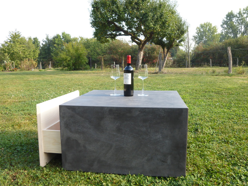 Wohnzimmertisch in Betonoptik. Sehr robuster, cubischer Tisch mit zwei Auszügen und Oberfläche aus Kasein-Lehmspachtelung.